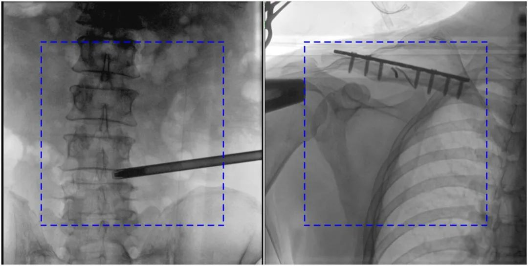 普愛醫(yī)療大平板一體式C形臂圖像與傳統(tǒng)圖像對(duì)比(藍(lán)色虛線內(nèi)為傳統(tǒng)21CM×21CM平板的成像區(qū)域)