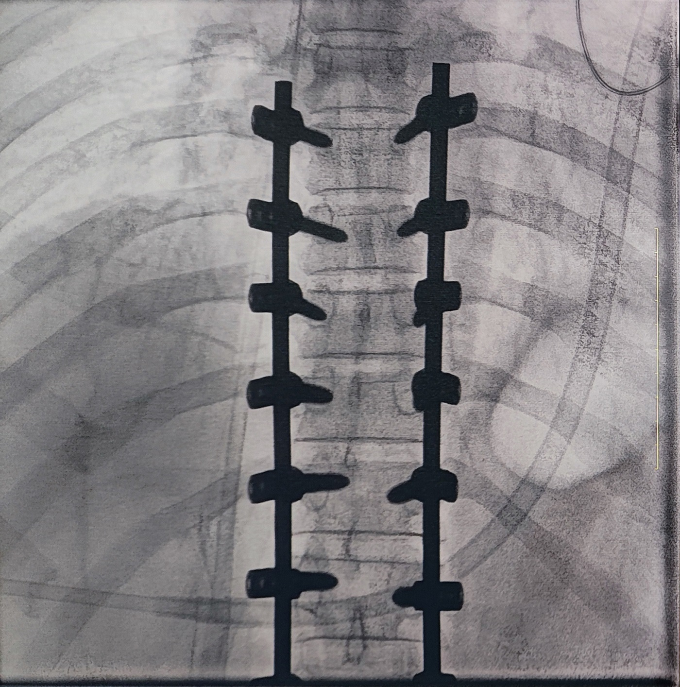 一場(chǎng)脊柱手術(shù)中,醫(yī)生需要拍攝跨越7個(gè)節(jié)段的脊柱影像,由于曝光的視野較大,常規(guī)視野的C形臂通常需要拍攝2-3次,普愛(ài)醫(yī)療大平板一體式C形臂30CM*30CM的“大視野”,輔助醫(yī)生一次性完成了7個(gè)節(jié)段的拍攝。最終,醫(yī)生在高清影像的輔助下完成了14枚螺釘?shù)木珳?zhǔn)定位、置入。