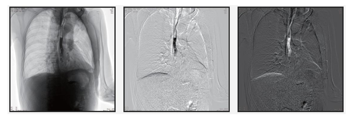 人體圖像通過組織均衡后,圖像細(xì)節(jié)更突出,肺紋理末端細(xì)小血管及骨骼的紋理、肌肉層次等清晰顯示。